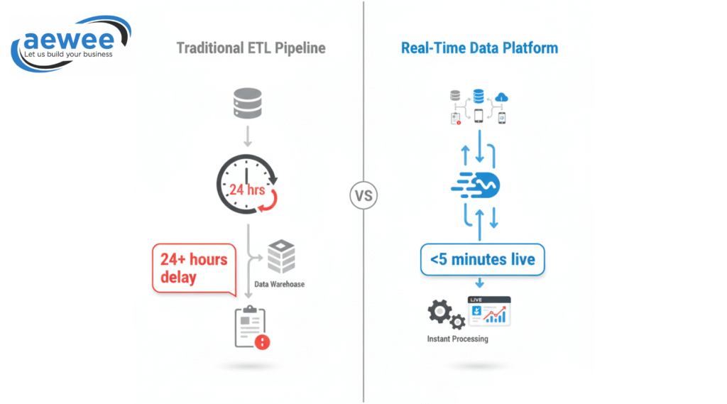 Modern businesses operate in real time. Customers expect instant confirmations, live tracking, and personalized experiences in every interaction. A batch job that runs at 2 AM cannot support real-time fraud detection, dynamic pricing, or live operational dashboards. Traditional ETL pipelines also become fragile as data sources grow—one schema change, one delayed file, and your entire reporting stack collapses for the day.